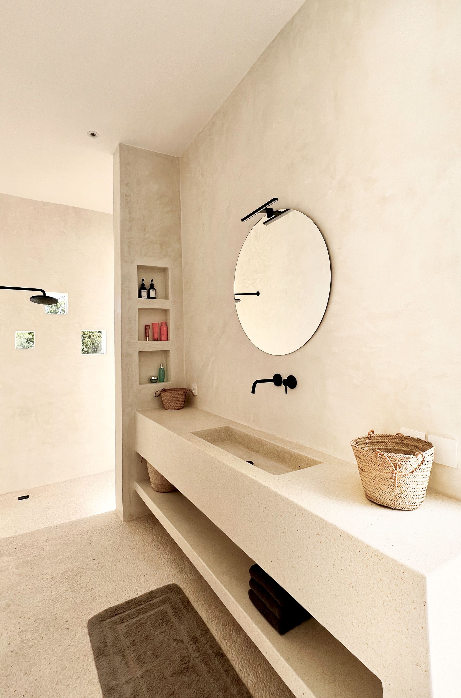 Africa means pure nature and that's exactly how you start the day in our bathrooms. Inspired by the beach, we have chosen natural materials and colours in stucco and terazzo to create a natural and warm aesthetic.